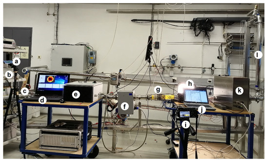 Flow loop installation and dual-modal EMFT and ET system. (a) Camera 1; (b) ultrasound flow meter device; (c) ultrasound flow meter sensors; (d) laptop for EMFT; (e) signal processor for EMFT; (f) EMFT sensors; (g) ET sensors; (h) back-light; (i) Camera 2; (j) laptop for ET; (k) signal processor for ET; (l) vertical pipe segment. In the pipe segment equipped with EMFT and ET sensors, the flow direction is from left to right.