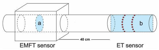 The EMFT and ET sensors were mounted in the inclined pipe section in series, as shown in Figure 1f,g. The distance between the EMFT and ET sensors was about 40 cm. This distance was assumed to ensure that no significant interference between EMFT and ET signals occurred. Naturally, this distance also means that the distributions of the velocity and phase fraction were not exactly equal in the positions of the EMFT and ET sensors. However, in the flow conditions considered in this study, the changes in the distributions were relatively smooth, and the approximation of measuring the same target at each time was assumed to be adequate.