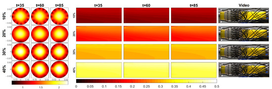 Figure 4 further illustrates the results of Cases 5, 10, 15, and 20, i.e., tests in which the true average velocity was 1.50 . Here, snapshots from the videos are shown side by side with the reconstructed oil volume fraction distributions in the respective test cases. As pointed out above, when the velocity of the fluid was high, the oil and water phases became mixed more thoroughly than in the cases with low velocities (cf. the FIKS reconstructions in Figure 3). Hence, also in Figure 4, the gradients in the oil volume fraction distributions are low. The values of these reconstructions, nearly homogeneous oil volume fraction distributions, were close to the true average values: 0.1, 0.2, 0.3, and 0.4 in Cases 5, 10, 15, and 20, respectively. The observation of oil and water being well mixed is also supported by the video snapshots shown on Figure 4: in each test case, the color of the mixture was rather uniform, but the differences between Cases 5, 10, 15. and 20 were clear; in Case 5, where the oil content was the smallest, the color of the fluid was light yellow, and in Case 20, corresponding to the highest oil content, the fluid color was the darkest (the rightmost column of Figure 4).