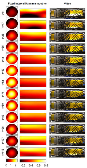 As noted in Section 2.1.1, the measurements associated with discrete time indices t consisted of a full frame of ET data and EMFT data corresponding to one (out of three) excitation. To match the times of the stationary reconstructions with those of the state estimates, the so-called sliding window method was used in the stationary reconstructions. That is, to form a full EMFT dataset for each time , EMFT data from the two preceding time steps and were merged with the data corresponding to time t.