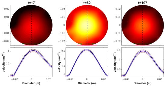 The FIKS reconstructions in Figure 5 show a nearly stratified velocity field when the average velocity was low, i.e., at and . In those periods of time, the flow speed was close to zero at the top of the pipe where the oil accumulated. This was an expected result: the flow of oil is slower than the flow of water, because oil has a higher viscosity than water. These findings align with the previous experimental work in [16]. Further, when the flow speed became higher (), the flow profile changed from nearly stratified to an axisymmetric profile, as shown by the velocity reconstructions.