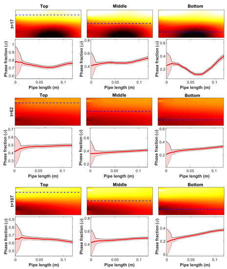 The EKF reconstructions for the phase fraction distributions of the oil are shown in top right corner of Figure 3. The phase fraction values were within the range of 0.09–0.15, which is reasonable as the true average phase fraction was 0.1 in Cases 1–5. Further, the phase fraction increased towards the top of the pipe, which was again reasonable because, at these flow speeds, oil and water are not perfectly mixed and oil, being the less dense component, tends to float on top of the water layers. However, in EKF reconstructions, the phase fractions were nearly uniform on the inflow boundary (left edge of the phase fraction images), and a higher oil content value on the top layers was reached only in the middle and end parts of the pipe segment. This is a known effect of EKF and was also shown in previous simulation studies [21], as well as when using EKF for a single modality ERT imaging [23,30,32]: The ET measurements were only sensitive to the electrical conductivity (and, thus, phase fraction) in the volume covered by the electrodes and not to conductivities near the ends of the pipe segment. Hence, when fluid entered the pipe segment through the inflow boundary, ET did not react to its variation from the background; it traced the variations only after it reached the vicinity of the first electrode layer. After the conductivity variation had been traced, the CD model carried the information on the transport of the fluid along the pipeline; for this reason, the inhomogeneous vertical profile of the phase fraction was visible on the outflow boundary, even though the measurements were not sensitive to the conductivity variations on the outflow boundary either.