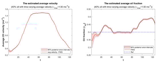 Finally, the spatially averaged FIKS-based reconstructions of the velocity field and oil fraction are plotted as functions of time in Figure 8. Again, the 95% CIs are plotted together with conditional mean estimates. The average velocity estimate was quite feasible; at the beginning of the experiment, it showed an average velocity somewhat above the true value (0.20 ); after, this it decreased a bit, but after a short initialization period, the FIKS traced the increasing trend of the true velocity and followed the increase up to about a 1.50 flow speed, where it remained from to , after which it started decreasing. The CIs of the average velocity were very narrow, which implied a high certainty of the estimated average velocity values. It is worth to notice, however, that in this work, we did not account for all possible sources of modeling errors (such as those caused by unknown electrode contact impedances, imperfections in the generated magnetic fields, and discretization errors); for this reason, the CIs were probably unrealistically narrow. Furthermore, it is worth noting that the effectiveness of the velocity curve was further supported by its alignment with the measurements obtained from the commercial ultrasound flow meter.