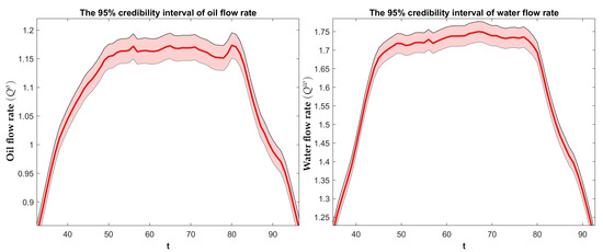 Case 21. The FIKS-based estimates for the oil (left) and water (right) flow rates as functions of time. The conditional mean (CM) estimates are drawn with red lines, and the approximate 95% posterior credible intervals are marked with light red areas.