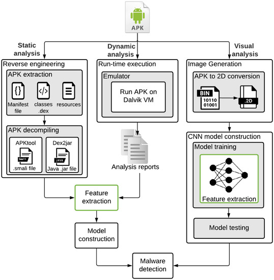 Consequently, the research problem behind this work is the growing threat of ransomware attacks on mobile systems and the need for an effective and efficient ransomware detection system. This motivated us to propose a system combining static-based machine learning and vision-based deep learning approaches to detect ransomware attacks. This is because most existing related works apply only one of these approaches in their solutions. They did not try to benefit from the advantages of both approaches within the same context. As a result, we developed a system that can identify ransomware attacks accurately and quickly, allowing for timely responses and reducing the impact of such attacks on organizations and individuals. Consequently, the static and dynamic analyses are built on feature engineering in which a database of malware features is deployed to implement the machine learning classification scheme. The rapid development of malware with constant changes raises the challenge of manually updating the malware feature database. Therefore, to reduce the cost of malware feature engineering, visual-based approaches are utilized to develop malware detection systems. In visual-based systems such as convolutional neural networks (CNN), the feature engineering process is embedded within the model construction phase, as shown in Figure 1.