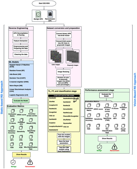 Figure 2 shows the high-level diagram of the E2D-RDS system that composes two proposed approaches to efficiently detect ransomware apps. The first static-based RD approach has utilized ML models, as will be discussed in Section 3.1. In contrast, the second vision-based RD approach has used different CNN models by exploiting the substantial advantages of FT and TL mechanisms, as will be clarified in Section 3.2.