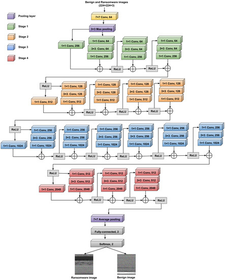 The structural design of the employed FT ResNet50 CNN model employed in the proposed RD approach is depicted in Figure 4. The pre-trained version of this ResNet50 CNN model is trained on more than ten million natural images with more than 1000 various classes composed in the common ImageNet dataset [57]. Thus, in the proposed vision-based RD approach, we exploited the resulting learned features and performed fine-tuning for the convolutional layers’ hyperparameters and weights to detect ransomware attacks efficiently and rapidly.