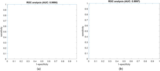 The obtained AROC curves for the best accomplished ResNet50 classification model using (a) color image dataset and (b) gray image dataset.