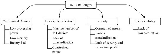 The challenges facing IoT could be divided into the following: the constrained nature of IoT devices, their identification, security, and the interoperability between different IoT technologies. We introduce these challenges in the following subsections.