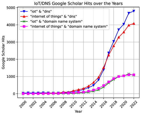 IoT/DNS Google Scholar hits between the years 2000 and 2022.