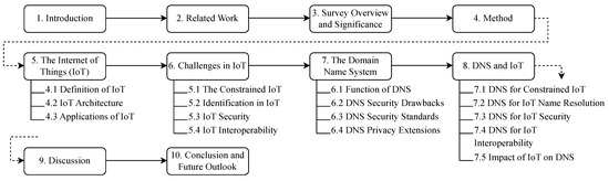 The work is divided as follows. Section 5 introduces IoT and its applications. Section 6 lists IoT challenges. Section 7 introduces DNS, its functions, and its security drawbacks. Furthermore, we explain DNS’s most common security extensions, which could serve both regular and IoT-connected devices. The literature is not rich with surveys about using DNS in IoT environments, even though we found numerous articles where DNS is purposefully used to address IoT challenges. Accordingly, Section 8 is a literature review of DNS-related IoT applications. The impact IoT might have on DNS is studied as well. In Section 9, we discuss our findings. We finalize with a conclusion in Section 10. The contents of the survey are detailed in Figure 3.