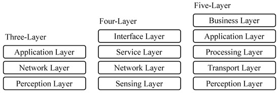As with its definition, IoT has many standard architectures. The most notable are the three-layer [33,34], four-layer [35], also referred to as Service-Oriented Architecture (SOA), and five-layer [34] architectures. See Figure 4.