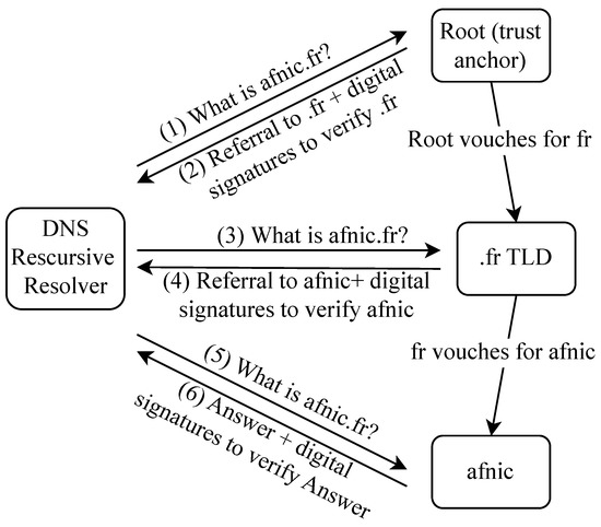 - Rose, S.; Larson, M.; Massey, D.; Austein, R.; Arends, R. DNS Security Introduction and Requirements; RFC 4033; Internet Society: Reston, VA, USA, 2005. [Google Scholar] [CrossRef]