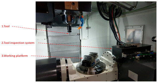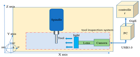 The experimental environment is shown in Figure 1. The tool inspection system can be set up inside the machine. The tool is mounted on the spindle. The inspection system is set up next to the working area, including the telecentric lens, light source, and camera. The experimental steps are as follows: (1) the tool cuts for 30 s; (2) the spindle moves to the tool inspection system for inspection for 30 s; and (3) steps 1 and 2 are repeated. The steps for tool defect inspection are as follows: first, the CNC machine moves the tool to the inspection position in the x, y, and z directions, and then the CNC machine’s spindle rotates the tool. Second, the PC sends a shooting signal to the camera, and the camera captures the image of the tool online. Third, the image is sent to the PC human–machine interface through USB3.0, and then the inspection results are sent back to the CNC machine through GigE, as shown in Figure 2 and Figure 3.
