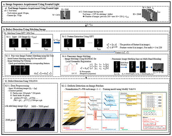 This paper is divided into six parts. The first two parts are the introduction and related work, while the third part explains the overall structure of the tool defect detection system. The fourth part introduces the image stitching process and the modified YOLOv4 process separately. The fifth part presents the experimental results. Finally, the sixth part presents the conclusion and future prospects, which summarize all the methods used in this study.