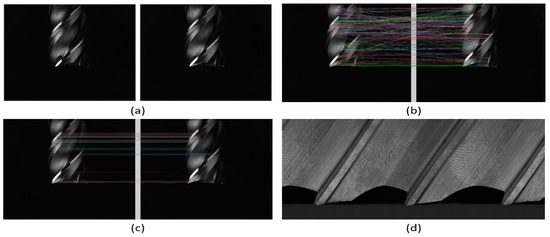 Stitching image 4-step result image. (a) The use of the SIFT algorithm to find local features in images. (b) All possible matching results between the two images. (c) Retainment of the best matching results. (d) Stitched image of the tool.