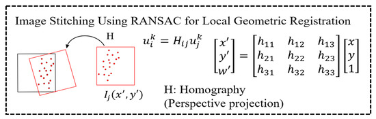 In the third step, we use the random sample consensus (RANSAC) method to find the homography information between the feature points’ positions and used it to stitch the images, as shown in Figure 6.