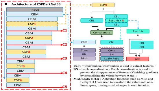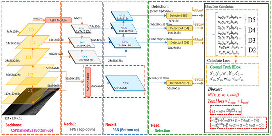 Figure 7 shows the overall architecture of the modified YOLOv4, which is divided into three parts: the backbone, neck, and head. The backbone uses CSPDarknet53 to extract local features, which are divided into five blocks named C1 to C5. Each block undergoes more convolutions.