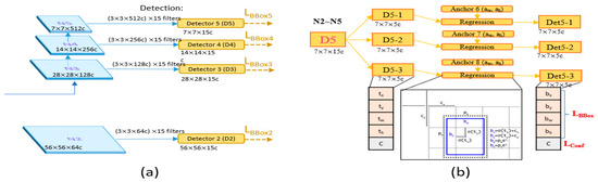 The head of the modified YOLOv4 consists of four detectors. The inputs are the N2, N3, N4, and N5 four-layer feature maps of the path aggregation network (Figure 11a). In the detectors, candidate box size and confidence score regression are performed, followed by backpropagation to update the entire model parameters. Higher-level detectors will detect larger targets as they have more global information in their feature maps. Each detector has pre-defined anchors, which serve as reference boxes of fixed size located on each point of the feature map to determine if there is a target present in each anchor, as shown in Figure 11b. If there is a target, the size and offset differences with the ground truth are then adjusted for subsequent fine-tuning. The anchors are defined beforehand using the K-means method on the training data, and since each detector must detect 3 different size targets, a total of 12 anchors are required.