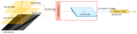 The original YOLOv4 only had three heads for detection, with the upper-level detector (low resolution) capable of detecting large defects. However, the original information of tool defect images, including small defects, is extremely important. In order to detect small defects better, the high-resolution C1 and C2 information is directly given to Detector 2 after being processed by ASPP to obtain candidate boxes (Figure 12). Therefore, the difference between the original YOLOv4 and the modified version lies in the fact that the modified version has four heads for detection (D2, D3, D4, and D5).