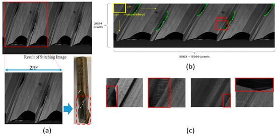 In order to detect all angles of the tool, we generated the stitched image of the tool as shown in Figure 13. A stitched image of a tool is obtained by taking several photos of a tool at multiple different angles and then stitching them together. Since there were only a few stitched images available, a patch-based method was used to augment the data. In this research, the patch size was defined as 224 × 224 pixels. A 224 × 224 sliding window was used to slide over the stitched image to generate image patches. The stride for a defect is 32 pixels. The defect area was labeled manually beforehand (the green area in Figure 13b). A patch is labeled as a defect if it overlaps with a defect.