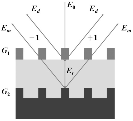 where , , , and are the reflective coefficients and phase shifts of the rectangular part and asymmetric part of the bottom grating structure, respectively. Substituting Equation (19) into Equation (5), the modified electric field that is refracted by the bottom grating can be derived as