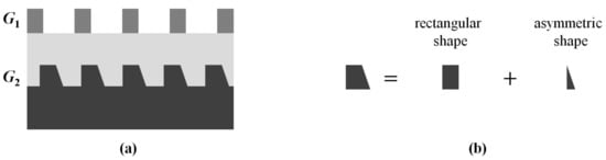 In the perfect bottom grating structure that we discussed in Section 2.1, the profile of the bottom grating is a rectangular shape; that is, the grating profile is symmetrical. This section will discuss the sidewall asymmetric bottom grating profile structure, as shown in Figure 2a. The asymmetric bottom grating structure can be separated into two parts, such that one is the rectangular shape, and the other one is the asymmetric shape, as shown in Figure 2b.
