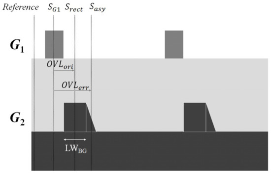 where is the overlay between the top grating and the rectangular part of the bottom grating; and are the positions of the rectangular part of the bottom grating and the top grating to the reference point, respectively; the is the overlay between the top grating and the asymmetric part of the bottom grating; and is the position of the asymmetric part of the bottom grating to the reference point. The former is the correct overlay of the top and bottom gratings without the affection of the asymmetric structure, and the latter is the overlay error caused by the asymmetric bottom grating profile structure. For clarity, Figure 3 shows the relations between , , , , and . The represents the linewidth of the bottom grating in Figure 3.