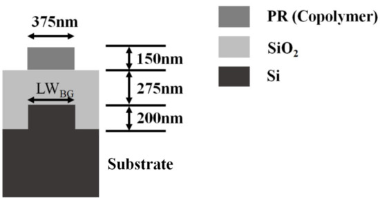 The third case is when , and the associated criteria is that . As shown in Figure 4c, if , the linewidth of the bottom grating will be nearly equal to or less than , which is allowable in the semiconductor design rule. Under this criterion, the , so that .