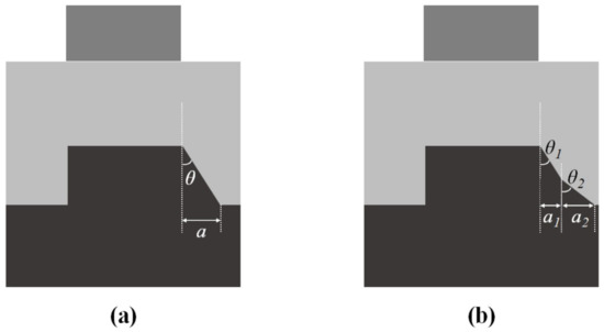 Next, a two-level sidewall asymmetric bottom grating structure was used to demonstrate the generalization usage of this methodology. Figure 6b shows the two-level SWA bottom grating structure, which was composed of two different asymmetric angles, namely, and , and the associated asymmetric lengths and . The intersection of the two different SWAs was set to be the middle height of the bottom grating. The corresponding values of and were from to .