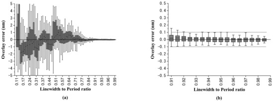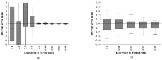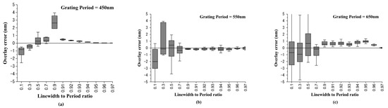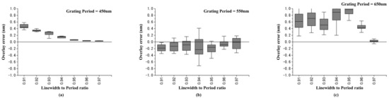 When the DBO target is being designed, the designer can change the grating period. Therefore, in the following case we considered changing the grating period from 750 nm to 450 nm with an interval of 100 nm. Figure 8a–c show the overlay error box plot with the linewidth-to-period ratio changing from 0.1 to 0.97 for grating periods of 450 nm, 550 nm, and 650 nm, respectively. The simulation results showed that the OVL error could be converged and reduced for different grating periods when the linewidth-to-period ratios were greater than 0.91. Figure 9a–c show the overlay error box plots with linewidth-to-period ratios changing from 0.91 to 0.99 for grating periods of 450 nm, 550 nm, and 650 nm, respectively. The simulation results of all simulated grating periods showed that the overlay error could be less than ±1 nm when the linewidth-to-period ratios were greater than 0.91. Moreover, when the linewidth-to-period ratios were equal to 0.97, the overlay error could be less than ±0.2 nm.