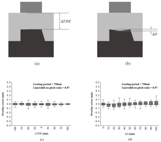In the actual semiconductor process, the coating thickness varies within a wafer. Therefore, it is necessary to consider the influence of thickness variation. In this study, we considered two cases of thickness variations. The first case was simply the thickness variation of SiO2, as shown in Figure 10a. For convenience, it was assumed that the thickness variation of SiO2 was (i.e., 275 nm ± 100 nm), the grating period was set to be 750 nm, and the linewidth-to-pitch ratio of the bottom grating was set to be 0.97. The second case was the top profile of the bottom grating that was sunken by the CMP process, as shown in Figure 10b. It was assumed that the sunken profile was symmetric, and the sunken depth was , and the settings of the grating period and the linewidth-to-pitch ratio were the same as those in the first case. Figure 10c shows the box plot of the overlay error under different thickness variations of the first case. Since the linewidth-to-pitch ratio of the bottom grating was set to be 0.97, the overlay error caused by the asymmetric sidewall structure was minimized. As seen in Figure 10c, even when the thickness of SiO2 varied by , the values of the overlay error could still be controlled within . For the overlay error simulation results of the second case, as shown in Figure 10d, the values of the overlay error could still be controlled within under the sunken depth of .