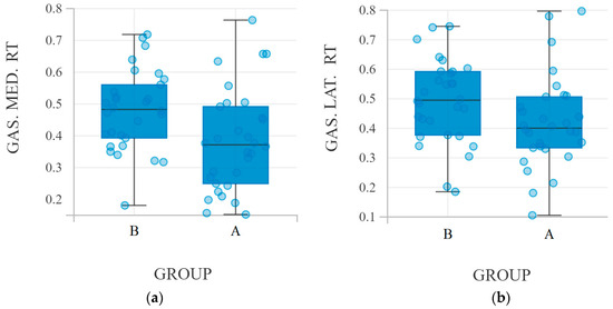 Differences between groups of goalkeepers (A and B) and % of maximum EMG signal values in the shot–defense phase. The charts (a,b) show the median % of maximal postural muscles EMG values among goalkeepers (GAS.MED and GAS.LAT).