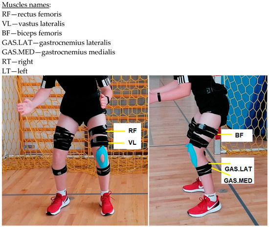 Placement of surface electrodes (anterior compartment of thigh muscles (RF RT and LT; VL RT and LT), posterior compartment of thigh muscles (BF RT and LT), and the gastrocnemius muscle (GAS.MED. RT and LT; GAS.LAT. RT and LT).