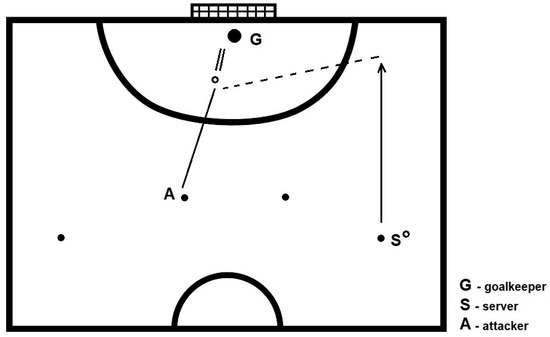 The positioning of players on the pitch and the game situation from passing the ball by the server (S) to receiving and striking the ball into the goal by the attacker (A) are shown in Figure 2. A series of three trials from each pitch side was carried out. Figure 2 demonstrates the game situation from the right side, and the same action (S–A) was performed three times from the left side of the pitch. The best attempt out of three from each side was taken for video analysis of shot-on-goal accuracy.