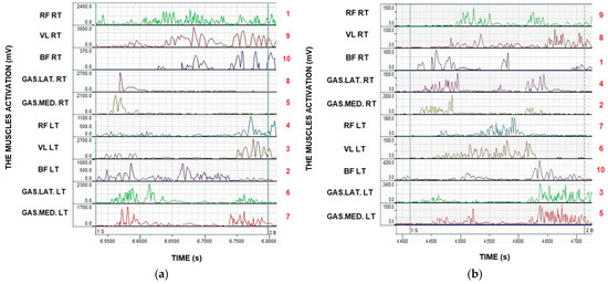 The pattern movement structure of selected leg muscles in senior goalkeepers (a) and youth goalkeepers (b).