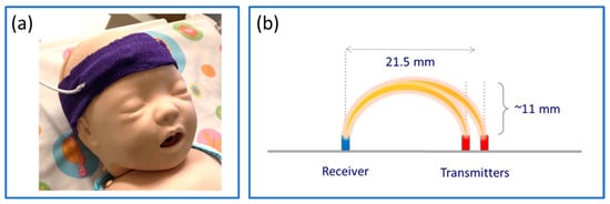 (a) A photograph of the infant-neonatal TOM sensor (Artinis Medical Systems B.V., The Netherlands) placed on a baby manikin’s forehead, covered with a clinical self-adhesive elastic bandage. (b) Schematic of the configuration of the two transmitters and one receiver embedded in the TOM sensor, illustrated in red and blue, respectively.