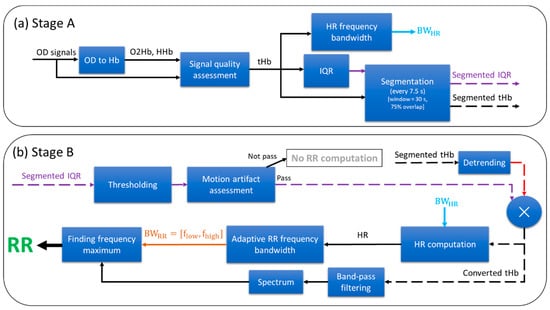 The block diagram of the proposed NRR (NIRS RR) algorithm, comprising Stage A and Stage B. (a) Stage A consists of four steps: preprocessing (including OD to Hb and signal quality assessment), HR frequency bandwidth, interquartile range (IQR), and segmentation. (b) Stage B consists of three steps: motion artifact assessment (including thresholding and motion artifact assessment), HR computation (including detrending, multiplication operator, and HR computation), and RR computation (including band-pass filtering, spectrum, adaptive RR frequency bandwidth, and finding frequency maximum).
