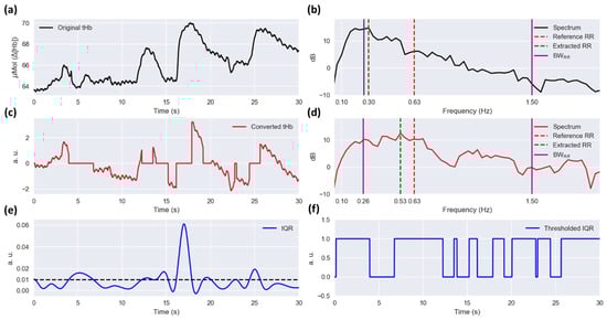 (a) A 30-second segment of the tHb signal recorded from one of the subjects (Measurement 15). (b) The spectrum computed for the original tHb signal, i.e., without motion artifact assessment and signal conversion. The dashed red and green lines and the solid magenta line depict the reference RR, extracted RR, and adaptive RR frequency bandwidth (), respectively. (c) The converted tHb signal after motion artifact assessment and multiplication by the thresholded IQR signal. (d) The spectrum of the converted tHb signal. (e) The IQR signal computed based on sliding windows of 1 s, interpolated to 100 Hz, and normalized by the median of the tHb signal. The dashed black line depicts the IQR threshold considered for motion artifact assessment (i.e., 1%). (f) The thresholded IQR signal. It is zero (i.e., contaminated with motion artifacts) if the IQR is above the defined threshold; otherwise, it is one.