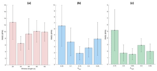 Sensitivity analysis of the main parameters of the NRR algorithm, i.e., window length and constants (i.e., ) regulating the lower and higher sides of the adaptive RR frequency bandwidth ( ). The bar chart of RMSE computed between the reference and extracted RRs with respect to (a) the window length, (b) the constant , and (c) the constant selected, averaged over all measurements. The error bars and bar heights depict the standard deviation and average of RMSE, respectively.