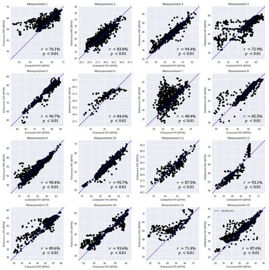 Scatter plots showing the linear association between the reference RR and the extracted RR by the NRR algorithm per measurement. The x and y axes represent the RR in breaths per minute (BPM). Each black dot corresponds to the reference and extracted RRs of each 30-second signal segment. The blue dashed line depicts the identity line (y = x). The correlation between the reference and extracted RRs is significant in each measurement (p < 0.01).
