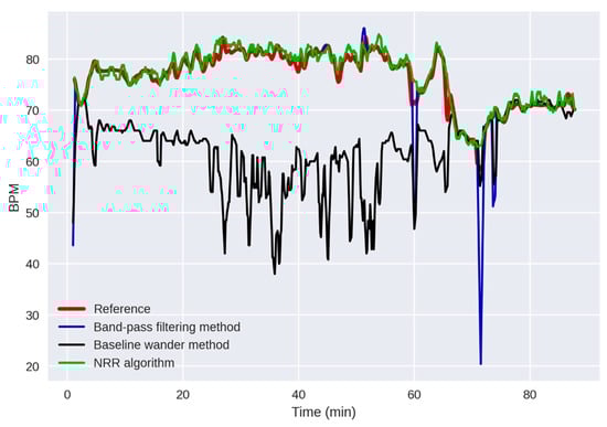 Figure 6 shows an example (Measurement 5) of the reference RR and the RR extracted by the proposed NRR algorithm compared with the ones obtained by the BPF and BW methods. It is observed that the BW method works poorly in this measurement in capturing the trend of the reference RR (except for the last ~20 min). The BPF method has provided a better RR extraction than the BW method, providing a Pearson’s correlation of approximately 87%. However, it has some outliers that have errors of more than approximately 20 BPM. On the contrary, the RR extracted by the NRR algorithm has no outliers and follows the trend of the reference RR from the beginning of the measurement to the end, providing a correlation of approximately 97%.