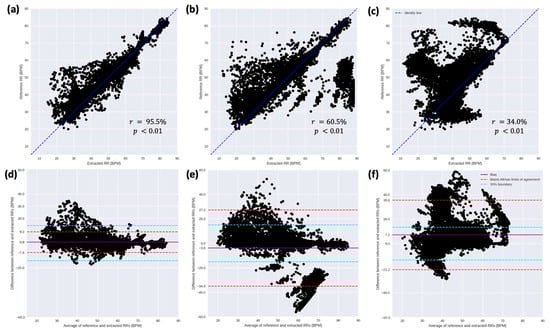 Scatter plots between the reference RR and the extracted RRs using (a) the NRR algorithm, (b) the band-pass filtering (BPF) method, and (c) the baseline wander (BW) method when all measurements are pooled together. Each black dot corresponds to each 30-second signal segment. The Bland–Altman plots of the reference RR and the extracted RRs using (d) the NRR algorithm, (e) the BPF method, and (f) the BW method. The solid magenta line and the dashed red lines depict the bias and the Bland–Altman limits of agreement, respectively. The cyan lines represent the 30% boundary, wherein the error between the reference and extracted RRs is lower than 30% of the mean of the pairwise RRs.