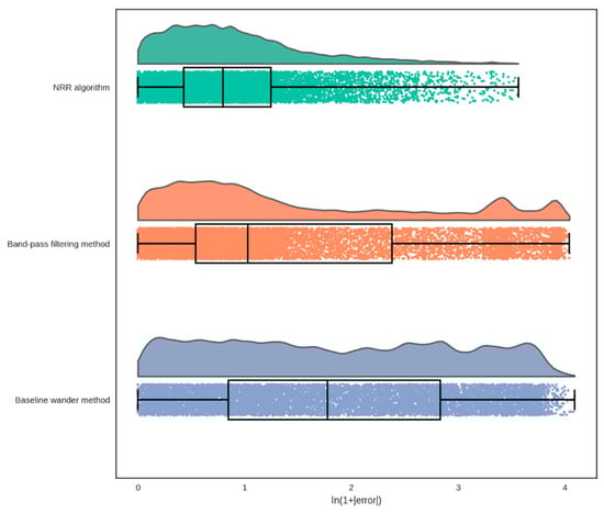 Raincloud plot of the absolute error between the reference RR and the extracted RR by using the NRR algorithm (first panel), the band-pass filtering (BPF) method (second panel), and the baseline wander (BW) method (third panel). The x axis represents the natural logarithm of the absolute error (in BPM) plus one. This was done to have a better visualization of the error distribution.