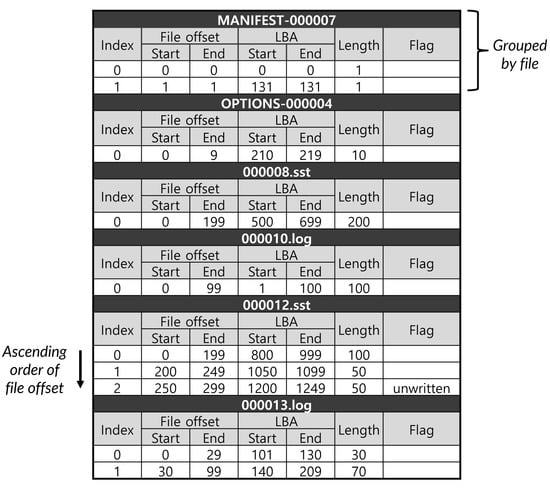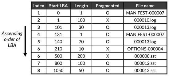 Figure 1 shows the information of the collected extent from the monitoring module. As shown in Figure 1, each extent contains the following information: file name, start offset, end offset, start LBA, end LBA, length, and flags. The pre-processing module filters out the necessary information in “fragInfo.txt” file to determine whether a file is fragmented or not: fine name, start LBA address of an extent, length of the extent, and flag (line 7 in Algorithm 1). The key information is the length because it means that the corresponding extent is contiguously placed from the start LBA address on the file system. In general, a file can be composed of one or more extents and the location of each extent in the file system depends on the sequence and timing of the write operations. If a file includes multiple extents and their LBA addresses are non-contiguous on the file system, it means that the file was fragmented with multiple extents. The higher the number of non-contiguous extents in a file, the worse the fragmentation issue that causes the collapse of the overall performance for the file access. Thus, the role of the pre-processing module is to scan extents that belong to the same file and to find non-contiguous ones. This scanning procedure skips extents whose “unwritten flag” is set as 1 (line 8 in Algorithm 1). The reason for such a skip is that the extent has not been permanently written yet on the file system; modern file systems (e.g., F2FS, ext4, and xfs) employ the delayed allocation that postpones allocating data in physical data blocks for performance improvement and optimization []. For example, an extent (index #2) belonging to the 000012.sst file in Figure 1 is skipped due to the behavior of the delayed allocation. Finally, the pre-processing module sorts the collected information from the scanning procedure based on the start LBA address (line 9 in Algorithm 1) and then stores the sorted information in the “fragProc.tbl” (see Figure 2).
