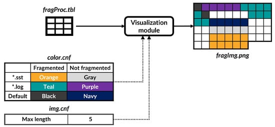 This module is responsible for visualizing the ratio of fragmentation on the file system with the information transformed from the pre-processing module (i.e., fragProc.tbl file). Figure 3 shows the overall process of this module when a user executes this module. As shown in Figure 3, this module makes a “fragImg.png” file as a result, with two configuration files: “color.cnf” and “img.cnf”. The “fragImg.png” file is composed of boxes, and each box means one logical block on the file system. The “color.cnf” file identifies fragmented areas based on the extension of files to clearly display the placement of data. In other words, the file maps fragmented and non-fragmented areas with different colors, as shown in Figure 3. The “img.cnf” file includes the maximum length to accelerate visualizing performance. Making the “fragImg.png” file requires high amounts of hardware resources and a lot of time, and the part written as a sequential region is unnecessary to display to a user. Therefore, we define the sequential region based on the number of contiguous LBA addresses. If the number of contiguous LBAs exceeds the maximum length, the visualization module does not record that region in the “fragImg.png” file. Otherwise, this module records the fragmented extents according to the color listed in the “color.cnf”. For example, if an extent includes non-contiguous LBA addresses, the data blocks belonging to the file titled with the “.sst” extension are displayed with an orange color (see “fragImg.png” in Figure 3). Therefore, a user easily discovers which file is fragmented or not, using the “fragImg.png” file, and can utilize such information to optimize the performance of the file system.