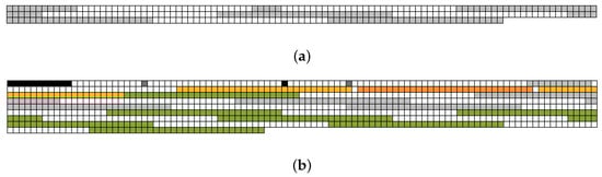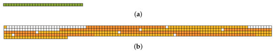Figure 6 shows our experimental results that come from the visualization module. VoltDB also uses a snapshot mechanism to guarantee the consistency of data. In our experiment, the period of the snapshot is set as 30 min; thus, a database file is created every 30 min. Figure 6a shows the ratio of fragmentation after running VoltDB over 60 s. As expected, Figure 6a only presents blocks colored with light gray because the snapshot is never triggered; this means that files are not fragmented, and the “.vpt”, “.digest”, and “.hash” files are used for the snapshot mechanism. Unlike Figure 6a, Figure 6b shows boxes with various colors because we collected them after running VoltDB for 1 h; in this case, the snapshot for guaranteeing the consistency of data is twice called during the evaluation. Figure 6b clearly shows that VoltDB also reveals the fragmentation issue over time; it presents two different orange colors. To study the reason for such fragmentation in the “.vpt” file, we monitored the system calls issued from VoltDB using strace. We figured out VoltDB calls write operations, along with SYNC_FILE_RANGE, for handling the snapshot mechanism, and the size of each operation is sometimes smaller than one page (i.e., 4096 bytes).