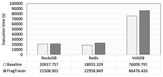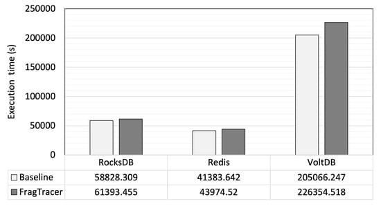 Figure 7 shows the total execution time when workload-F is executed on different databases, respectively. As shown in Figure 7, RocksDB and Redis show a similar execution time whether FragTracer runs or not; FragTracer includes only a 2% runtime overhead compared with the baseline. The results are interesting in that FragTracer indeed uses the hardware resources (e.g., CPU, memory, and I/O block) for monitoring the ratio of fragmentation and generating it in graphical form. Meanwhile, VoltDB shows a larger overhead than other database applications. In VoltDB, the FragTracer increases the runtime by 21% compared with the baseline. We believe that it is a reasonable overhead, in that FragTracer shows the ratio of fragmentation with ease and that it can sometimes be utilized for analyzing the performance issue on the filesystem.