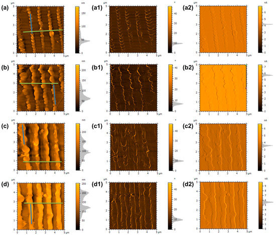 Simultaneous AFM topography, phase contrast, and amplitude images performed on phase mask laser irradiated Az0.25PSS-L (a,a1,a2), Az0.50PSS-L (b,b1,b2), Az0.75PSS-L (c,c1,c2), and Az1.00PSS-L (d,d1,d2). The positions of the cross-section profiles taken perpendicularly to the SRGs are marked with green lines, while the ones along the SRGs are marked with blue lines. In the amplitude images, nA is a procedure-defined unit.