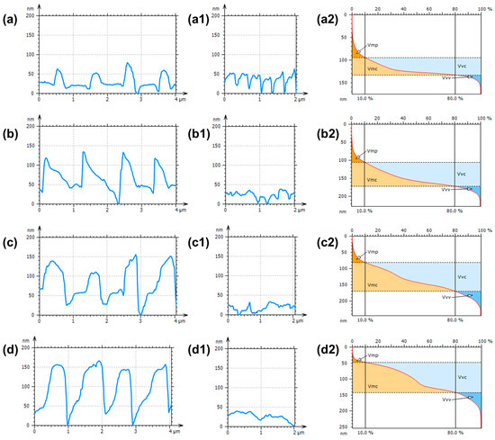 Cross-section profiles taken perpendicularly and along the SRGs and Abbott curves used to calculate the functional volume parameters, based on the AFM topography images, obtained for the phase mask laser irradiated Az0.25PSS-L (a,a1,a2), Az0.50PSS-L (b,b1,b2), Az0.75PSS-L (c,c1,c2), and Az1.00PSS-L (d,d1,d2).